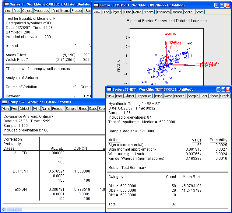EViews´Â °£´ÜÇÑ ±â¼ú Åë°èºÎÅÍ ¸ð¼öÀû, ºñ¸ð¼öÀû °¡¼³ °ËÁ¤±îÁö ¸ðµç °ÍÀ» Æ÷ÇÔÇÏ´Â ±¤¹üÀ§ ±âº» Åë°è ºÐ¼®À» Áö¿øÇÕ´Ï´Ù.