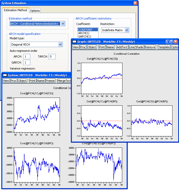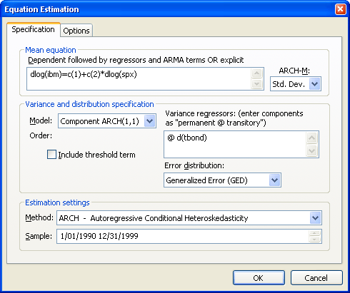 ½Ã¸®ÁîÀÇ ºÐ»êÀÌ ½Ã°£¿¡ µû¶ó º¯µ¿µÇ¸é EViews´Â ´Ù¾çÇÑ ÀÚ±âȸ±Í Á¶°ÇºÎ À̺лê(ARCH) ¸ðÇüÀ» »ç¿ëÇÏ¿© ºÐ»êÀÇ °æ·Î¸¦ ÃßÁ¤ÇÒ ¼ö ÀÖ½À´Ï´Ù. EViews´Â GARCH(p,q)¿Í EGARCH(p,q), TARCH(p,q), PARCH(p,q), ±×¸®°í GARCH ¼ººÐ ƯÁ¤È­¸¦ ó¸®ÇÒ ¼ö ÀÖ°í, Á¤±Ô¸¦ µû¸£´Â ¿ÀÂ÷ÀÇ ÃÖ´ë °¡´É¼º ÃßÁ¤°ú ½ºÆ©´øÆ®ÀÇ t Åë°è·®À̳ª ÀϹÝÈ­ ¿ÀÂ÷ ºÐÆ÷¸¦ Á¦°øÇÕ´Ï´Ù. ARCH ¸ðÇüÀÇ Æò±Õ ¹æÁ¤½ÄÀº ARCH¿Í ARMA Ç×ÀÌ Æ÷ÇԵǾî ÀÖÀ¸¸ç, Æò±Õ°ú ºÐ»ê ¹æÁ¤½Ä Àº ¿Ü»ý º¯¼ö¸¦ Çã¿ëÇÕ´Ï´Ù.