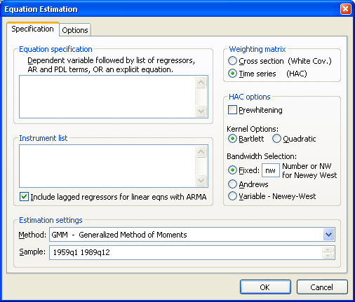 EViews´Â Ⱦ´Ü¸é°ú ½Ã°è¿­ µ¥ÀÌÅÍ(´ÜÀÏ, ´ÙÁß ¹æÁ¤½Ä)¿¡ ´ëÇÑ ÀϹÝÈ­ Àû·ü¹ý ÃßÁ¤À» Áö¿øÇÕ´Ï´Ù. °¡Áß ¿É¼Ç¿¡´Â Ⱦ´Ü¸é µ¥ÀÌÅÍ¿¡ ´ëÇÑ ¼ø¼ö °øºÐ»ê Çà·Ä°ú ½Ã°è¿­ µ¥ÀÌÅÍ¿¡ ´ëÇÑ ´Ù¾çÇÑ HAC °øºÐ»ê Çà·ÄÀÌ Æ÷ÇԵǾî ÀÖ½À´Ï´Ù. ¶ÇÇÑ HAC ¿É¼ÇÀº »çÀü¹é»öÈ­(prewhitening)¿Í ´Ù¾çÇÑ ÇÙ(Kernel), ±×¸®°í °íÁ¤, Andrews, ¶Ç´Â Newey-West bandwith ¼±ÅùýÀ» Æ÷ÇÔÇϰí ÀÖ½À´Ï´Ù. »ç¿ëÀÚ´Â ¹Ýº¹ ÀýÂ÷¸¦ »ç¿ëÇϰųª ¿¬¼ÓÀûÀÎ ÃÖ½ÅÈ­ ÀýÂ÷¸¦ ÀÌ¿ëÇÏ¿© GMM ¹æÁ¤½ÄÀ» ÃßÁ¤ÇÒ ¼ö ÀÖ½À´Ï´Ù. ¾àµµ±¸Åë°è¸¦ Æ÷ÇÔÇÑ GMM ¹æÁ¤½ÄÀÇ »çÈÄ ÃßÁ¤ Áø´Ü ¶ÇÇÑ À¯¿ëÇÕ´Ï´Ù.