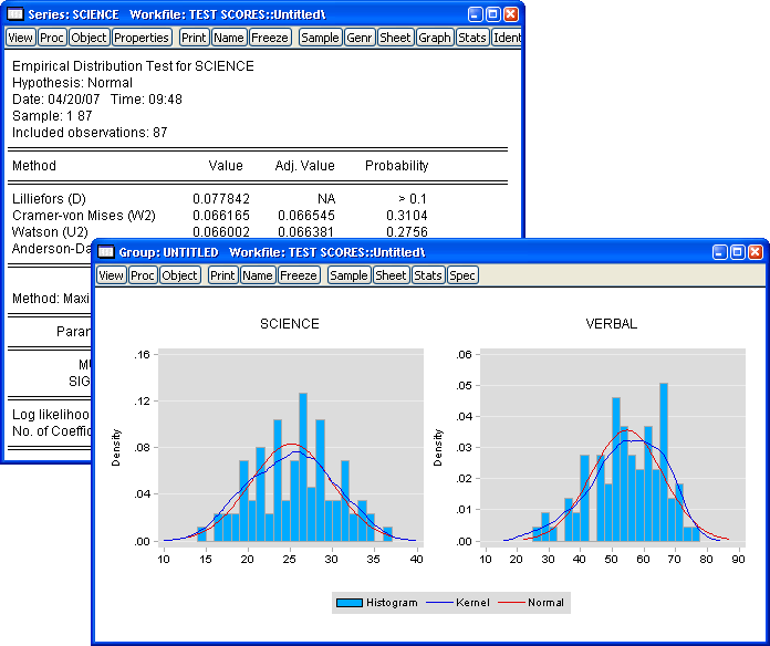 ½Ã¸®Áî°¡ Á¤±Ô ºÐÆ÷¸¦ µû¸£´ÂÁö, ¾Æ´Ï¸é Áö¼ö ºÐÆ÷, ±Ø´Ü°ª, ·ÎÁö½ºÆ½(logistic), Ä«ÀÌ Á¦°ö, ¿ÍÀÌºí ¶Ç´Â °¨¸¶ ºÐÆ÷ µî°ú °°ÀÌ ¶Ç ´Ù¸¥ ºÐÆ÷¸¦ µû¸£´Â Áö¸¦ ¾Ë±â À§Çؼ­ Kolmogorov-Smirnov, Liliefors, Cramer von Mises¿Í Anderson-Darling °ËÁ¤À» ¼öÇàÇÒ ¼ö ÀÖ½À´Ï´Ù.