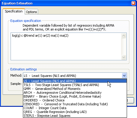 EViews´Â ´Ù¾çÇÑ ÆÐ³Î°ú ÇÕµ¿ µ¥ÀÌÅÍ ÃßÁ¤¹ýÀ» Áö¿øÇÕ´Ï´Ù. ¶ÇÇÑ º¸Åë ¼±Çü°ú ºñ¼±Çü ÃÖ¼ÒÁ¦°ö, ¹æÁ¤½Ä ÃßÁ¤¹ýÀº 2SLS/IV¿Í ÀϹÝÈ­ 2SLS/IV, GMMÀÌ Æ÷ÇÔÇÕ´Ï´Ù. À̰ÍÀº ÃßÁ¤°ª º¹¼Ò µ¿Àû ÆÐ³Î µ¥ÀÌÅÍ Æ¯Á¤È­(ÃßÁ¤·®ÀÇ Anderson-Hsiao¿Í Arellano-Bond Çü½Ä Æ÷ÇÔ)¿¡ »ç¿ëµÉ ¼ö ÀÖ½À´Ï´Ù.
