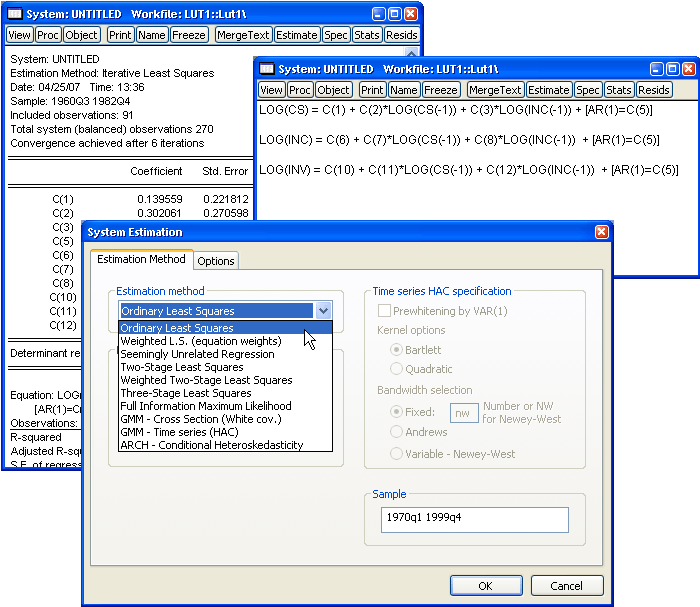 EViews´Â ¹æÁ¤½ÄÀÇ ½Ã½ºÅÛ ºÐ¼®¿¡ À־ °­·ÂÇÑ µµ±¸¸¦ Á¦°øÇÕ´Ï´Ù. EViews´Â OLS, À̴ܰè ÃÖ¼Ò Á¦°ö, º¸±â¿¡ ¹«°üÇÑ È¸±Í, »ï´Ü°è ÃÖ¼Ò Á¦°ö, GMM¿Í KIMLÀ¸·Î ¹æÁ¤½ÄÀÇ ¼±Çü°ú ºñ¼±Çü ½Ã½ºÅÛ ÃßÁ¤¿¡ »ç¿ëµÉ ¼ö ÀÖ½À´Ï´Ù. ½Ã½ºÅÛÀº ±³Â÷ ¹æÁ¤½Ä Á¦¾àÀ» Æ÷ÇÔÇÒ ¼ö ÀÖÀ¸¸ç, ´ëºÎºÐÀÇ °æ¿ì¿¡ ¾î¶² ¼ø¼­ÀÇ ÀÚ±âȸ±Í ¿ÀÂ÷°¡ ÀÖÀ» ¼ö ÀÖ½À´Ï´Ù.