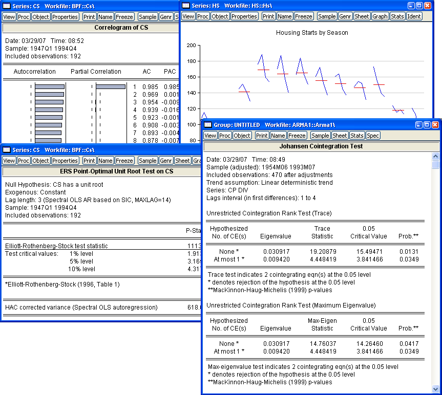 EViews´Â ´ÜÀ§±Ù °ËÁ¤(ADF, Phillips-Perron, KPSS, DFGLS, ERS, or Ng-Perron for single time series and Levin-Lin-Chu, Breitung, Im-Pesaran-Shin, Fisher, or Hadri for panel data)°ú °øÀûºÐ °ËÁ¤(Johansen for with MacKinnon-Haug-Michelis critical values and p-values ordinary data, and Pedroni, Kao, or Fisher for panel data), Àΰú¼º, ±×¸®°í µ¶¸³ °ËÁ¤Àº ¹°·Ð, Àڱ⠻ó°ü°ú ÆíÀڱ⠻ó°ü ÇÔ¼ö, Q-Åë°è¿Í ±³Â÷ »ó°ü ÇÔ¼öµµ Á¦°øÇÕ´Ï´Ù.