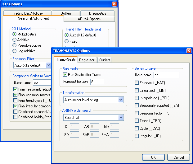 ¶ÇÇÑ EViews´Â ¹Ì±¹ Àα¸ Á¶»ç±¹ÀÇ X11¿Í X12-ARIMA °èÀý º¯µ¿ ÇÁ·Î±×·¥°ú À¯·´ ¿¬±¸¼Ò¿¡¼­ ÀÚÁÖ »ç¿ëµÇ´Â Tramo/Seats ¼ÒÇÁÆ®¿þ¾î¸¦ ½±°Ô »ç¿ëÇÒ ¼ö ÀÖµµ·Ï Áö¿øÇÕ´Ï´Ù. °¡¹ý, ½Â¹ý ¹æ½ÄÀ» ÀÌ¿ëÇÑ ´Ü¼ø °èÀý º¯µ¿ Á¶Á¤ ¶ÇÇÑ EViews¿¡¼­ Áö¿øÇÕ´Ï´Ù.